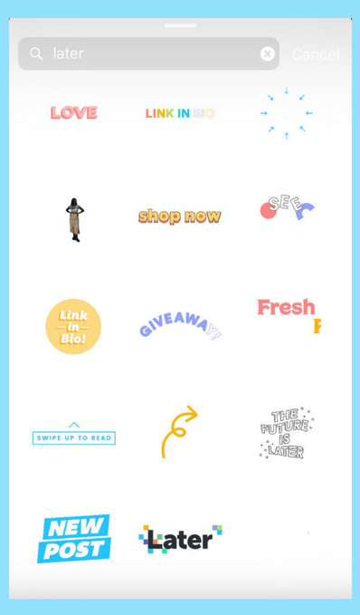 And voilĂ , your GIF stickers are all ready to go! If you're planning a special launch, you might want to upload them in advance, we found that our GIFs took about a week for all of them to show up under the search term "Later" on Instagram.