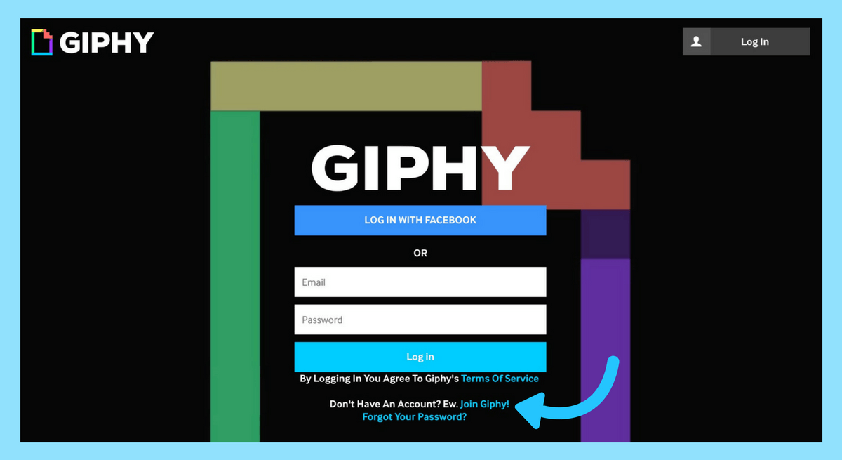 To create a brand channel, simply open Giphy, click on "Log In" in the top right corner of the homepage, and then select "Join Giphy" on the following page.