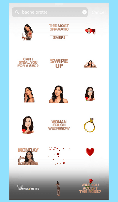 For example, since a ton of people like to post on Instagram Stories while watching The Bachelorette, ABC created a series of branded GIFs featuring their star, Becca. There's the branded logo, but there's also her signature catch phrases and various facial reactions.