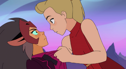 This leads to the two having several tense interactions, with Adora saving Catra from falling off a cliff and vice versa a few times. Although they were portrayed as best friends (now ex-best friends), there was some romantic tension depicted at Princess Prom. Being the charismatic person she is, Catra shows up, surprises Adora, and then teases her by leaving a note in the trashcan and mindlessly walking about while Lonnie and the others plant heat bombs in the castle. Eventually, the dance begins, and Adora goes through several different partners, the first of which is Catra, who seems to be smug as if she arranged it to be so. The two dance together, but their dance is unlike the others because Catra ends up being bold and dipping Adora and such, showing the two to have a much closer dance than the other partners.