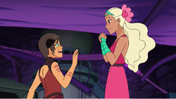 Catra spends her time mostly mocking Adora, before being driven off by Mermista. Things truly begin to get ambiguous during Princess Prom. Catra exploits Adora's former friendship to capture Glimmer and Bow while stealing the Sword of Protection. Catra then gives Adora back the sword and lets her escape unmolested. In the episode "Promise", Catra and Adora meet again, and start out civil and friendly with each other, even helping each other against the defenses of the First Ones' Temple. However, the Temple also shows Catra and Adora's past as children, as well as causing them to relive some painful memories. This seems to cement a rage in Catra, saying that Adora was a hero and that "every hero needs a sidekick". This implies that Catra has come to believe that Adora only saw her as a second, and was being a hero for the sake of glory. In the episode "White Out", Adora gets the upper hand on Catra, although Catra doesn't seem particularly bothered, expressing the belief that Adora won't strike her.