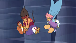 - —Catra and Adora with Adora hanging by goo at the edge of a precipice. Promise/Transcript, minute 3:29