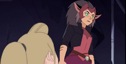 - Catra : "[contemplatively] I wonder what I could've been if I'd gotten rid of you sooner... [Catra cuts the last of the goo holding Adora up; Adora shrieks as she falls, catching a rock handhold on the way down]"
