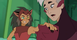 When Adora attacks and defeats her under the influence of the Corrupted First Ones' Disk, she shows shock and fear at Adora's rage, proving that she truly didn't believe Adora would strike her. After Adora is subdued by Scorpia, she spends time mocking Adora's unconscious form. In season three, after being effectively banished by Hordak, Catra wastes no time in establishing her control over the residents of the Crimson Waste. This could show a fondness for power and control, but when Scorpia suggests staying and noting how Catra hated the Fright Zone, Catra (having captured Adora) chooses to go back anyway, upon Catra learning that Shadow Weaver (their mother figure) visited Adora after leaving her. Returning to the Fright Zone, only to be attacked by Shadow Weaver, and hearing that Adora was right about the dangers of Hordak's plan to open a portal, and it makes her snap, causing her to attack Entrapta and lie to Hordak to get the portal open, despite it meaning suicide for her and the destruction of everyone and everything on the planet. In the resulting time/space collapse, Catra and Adora fight, Catra telling Adora all the while how it was her presence that caused all this. This could be one of two things, either an inability to take responsibility for her actions or resentment towards Adora. However Catra could not hold her grudge forever and eventually the two fixed their broken bond which would also lead them to form a romantic relationship.